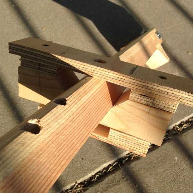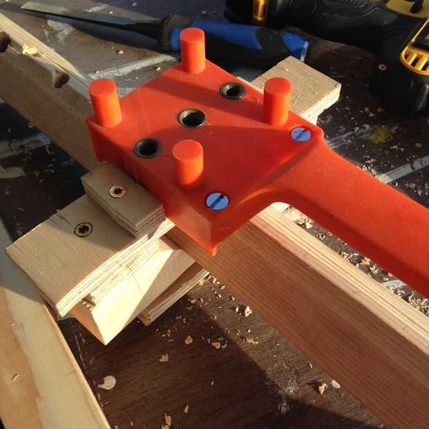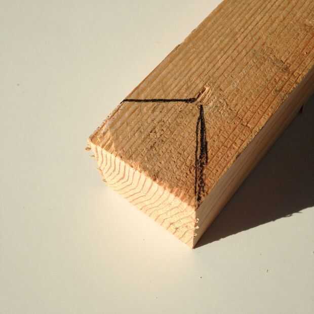 Los cortes de inglete en el brazo horizontal hechos con una sierra de mano, entonces limpiados con un cincel para precisamente. Un largo tornillo de cabeza ala permitió el brazo a moverse sin necesidad de herramientas.