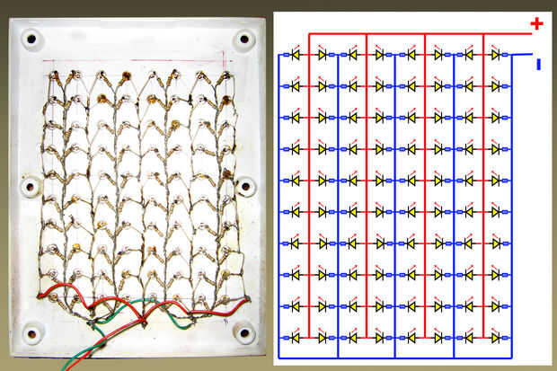 Cada uno de los años 80 se suelda de LED con una resistencia de 150 ohms para las patas negativas (-).