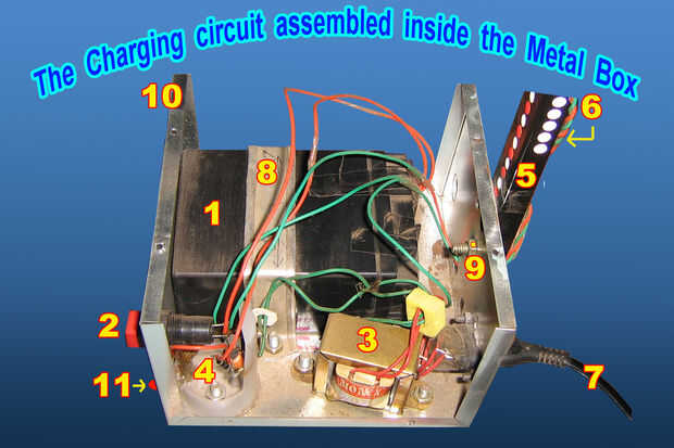 En esta fotografía se puede ver cómo el circuito entero es colocado y conectado dentro de la caja de Metal de 5 "x 5" x 3 ". Los números siguientes se refieren a las partes en la foto.