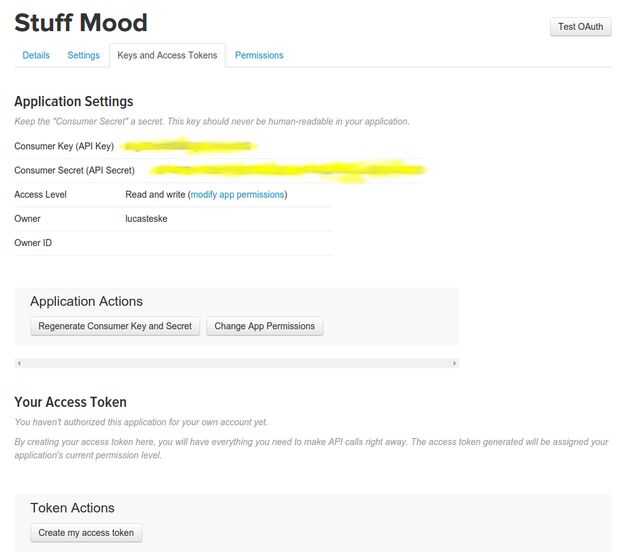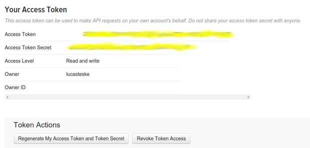 Después de usted debe volver a una página con consumidores (clave o secreto) y el Token de acceso (clave o secreto). Mantener esta página abierta debido a que necesitaremos más adelante.