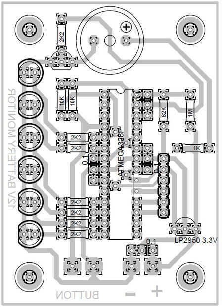 Usé la versión gratuita de Eagle para el diseño de la PCB. Todos los componentes, excepto el pulsador, se montan en el PCB. Montaje es fácil, con la excepción de soldar los LEDs. Asegúrese de que todos los LEDs son la misma altura. Utilizar a espaciadores de 20mm para montar la unidad y utilizar esto como referencia para la altura de LED.
