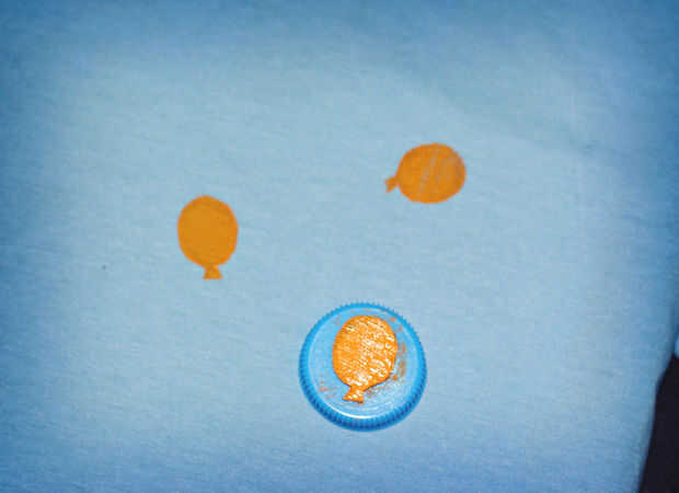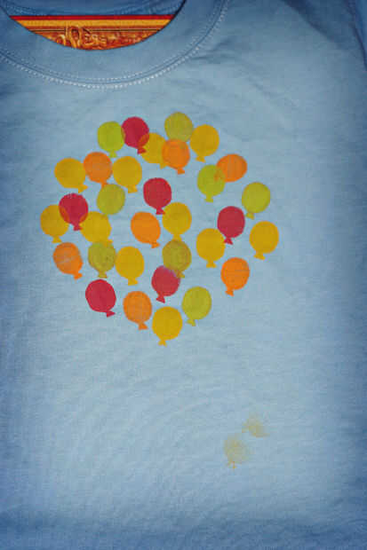 Entonces que mi hijo me ayude a estampar unos globos en la camiseta. Puedes ver que lo hizo el balón derecho (lado) por sí mismo inmediatamente después de pisotearon el primer globo. Después de eso, ayudó a guiarlo para estampar globos en estéticamente agradables arreglos. Él no parecía a la mente me bloqueo groseramente su libertad creativa.