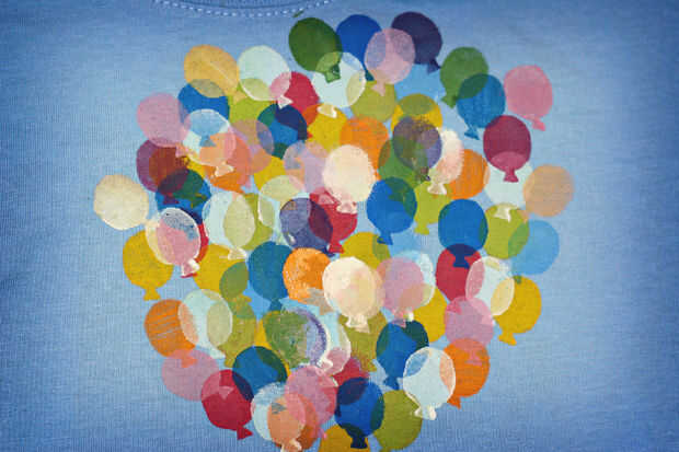 Limpiar la camisa un poco usando pintura en mi pincel para cubrir algunas de las áreas superpuestas de los globos. Aunque los globos son parcialmente transparentes, siempre quería tener los mismos globos de color en la parte superior (que es lo que sucedió porque empezamos con un color, pintando varios globos y terminado con el otro).