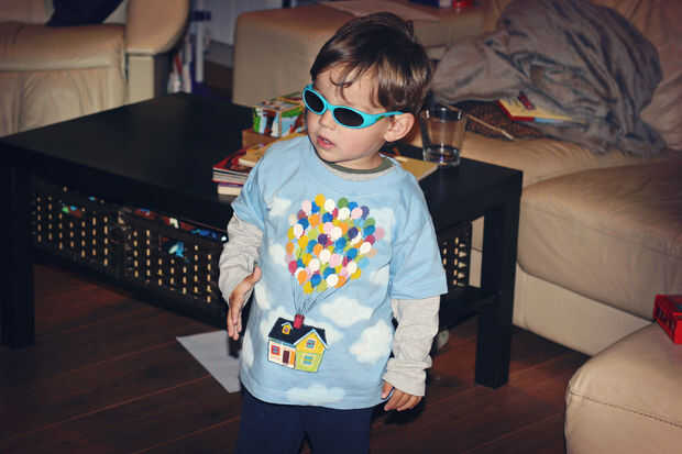 Mi hijo llevaba su camiseta a la guardería y lució con orgullo a todos sus amigos. Cuando fui a tomarlo por la tarde, estaba jugando con otro niño cuya madre ha pasado llegar a sólo unos minutos más tarde. Es entonces cuando el niño mostró la camiseta del"globo" a su madre, diciendo que él quería que le comprara uno también! Yo estaba orgulloso, pero realmente un poco sorprendido por la popularidad de su nueva camiseta. Personalmente disfruté las camisas de Wall-E mejor, pero los niños parecen preferir esta camisa.