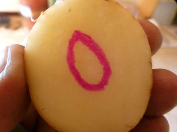 Marque un solo pétalo en un trozo de patata con rotulador. Tallar la forma usando el cuchillo. Sello de patata para los pétalos de flores está listo
