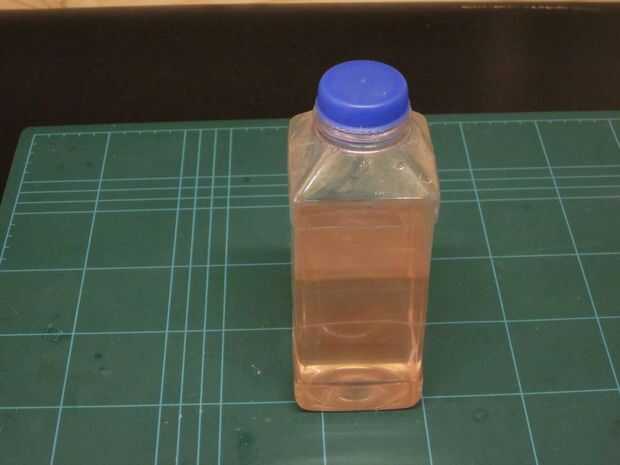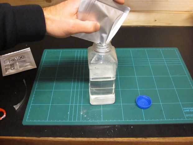 Añadir parte A en la cantidad adecuada de agua destilada (en mi caso 250ml.) Usted puede obtener esto de una gran variedad de tiendas de hogar y bricolaje, también solía utilizarse en mayores 'mojado' las baterías de coche, por lo que probablemente podría obtener algunos en una tienda de coches.
