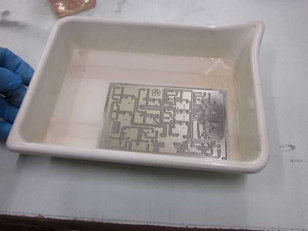 Simplemente pegue la placa en una bandeja fotográfica limpio (u otra bandeja, idealmente con un pico como éste) y verter sobre la solución de la galjanoplastia, por lo que la Junta está cubierta completamente. Agite nuevamente un cuarto un poco. Usted verá un instante reacción (con una solución fresca) así que no cuelgue! Déjalo para entre 30 segundos y 2 minutos para obtener una buen plano incluso capa de estaño. Cuanto más tiempo lo dejas, el grueso va a ser, pero también el más rápido tu voluntad la solución de la galjanoplastia de escape.