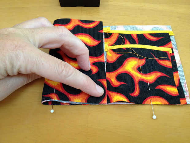Coser de un extremo hasta el primer doblez, omitir la broca doblada entre las clavijas, coser la sección media, omitir el segundo doblez y cosa hasta el final. Los saltos son para permitir que las áreas que deben coincidir para antes de la costura más difícil de las longitudes desiguales, lo que haremos a continuación.