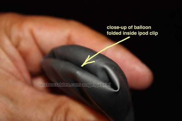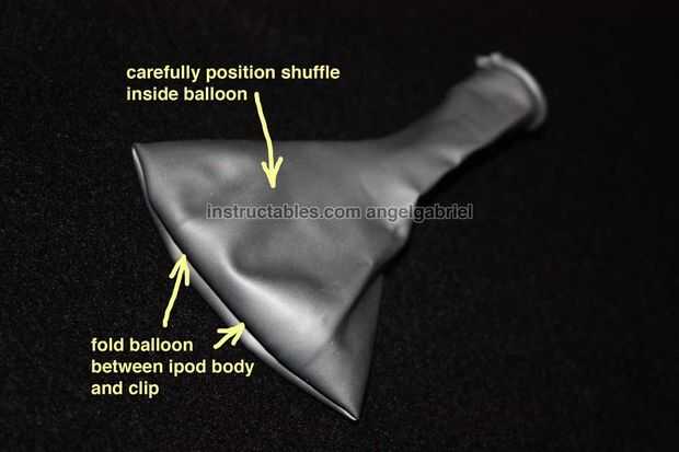 Inserte el iPod en globo. Encontré que metiendo el extremo redondo del globo bajo el iPod clip ayuda a mantenerlo limpio. También le da la opción de usar el clip, a pesar de no usarlo.