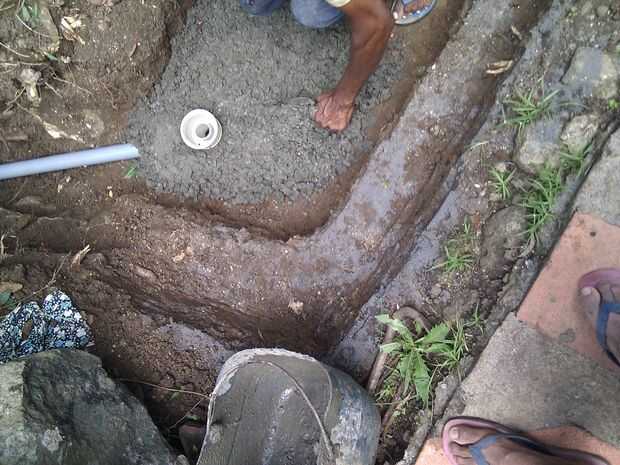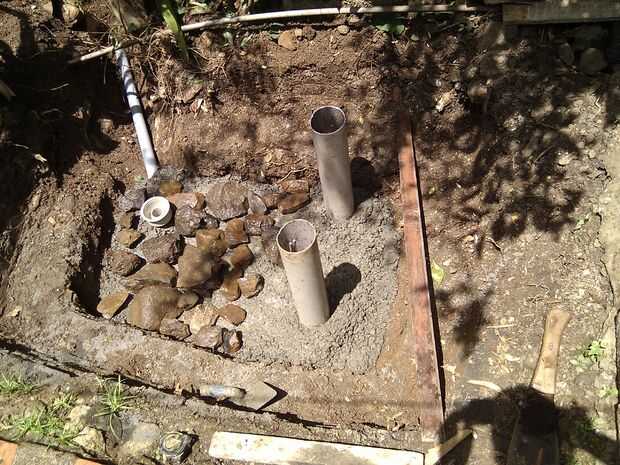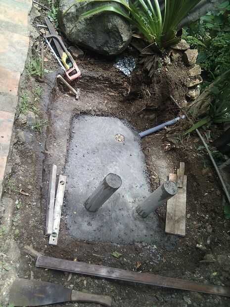 La primera cosa a hacer era para alinear correctamente el tubo de desagüe y unos 5 grados la inclinación del ángulo hacia la parte inferior de la zanja y asegurar la tubería temporalmente con el suelo. Luego agregar lentamente el hormigón en el centro del agujero y moviendo poco al lado y que cubre la parte delantera. Mientras el hormigón esté todavía fresco cortar los tubos de PVC de igual longitud y empujar en ellos el mortero, al mismo tiempo cortar dos trozos de barra de metal de la misma longitud y uso hilo para atarlos juntos y luego poner el refuerzo interior de la tubería de PVC en el centro pegándolas en el concreto de enlace y hacer lo mismo para la siguiente viga. Puesto que la base se llena con hormigón, coloqué unas piedras en el hormigón base para ahorrar algunos concreto. Entonces la más concreta se vierten para llenar todo el mundo y alcanzar el nivel de satisfacción.