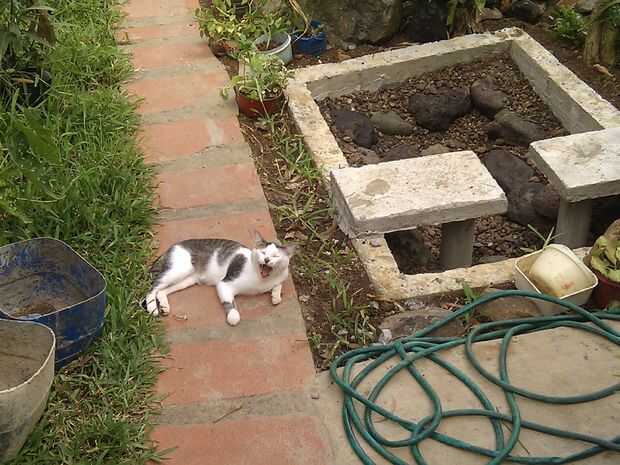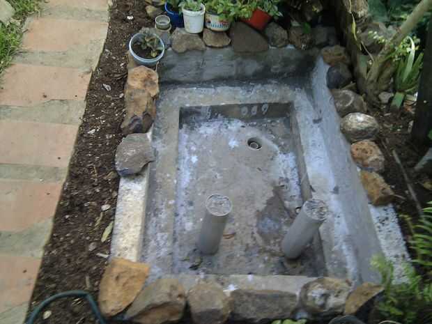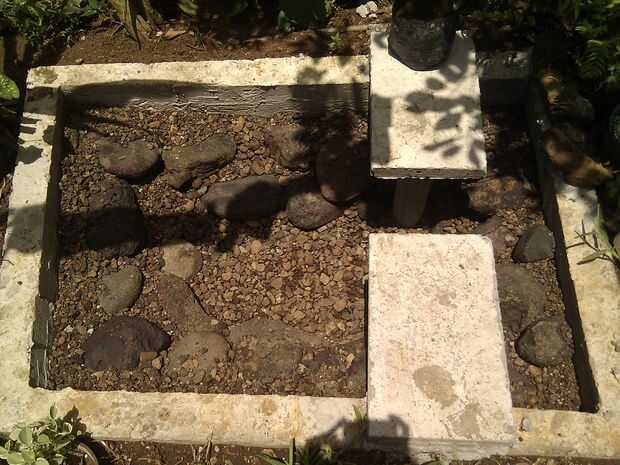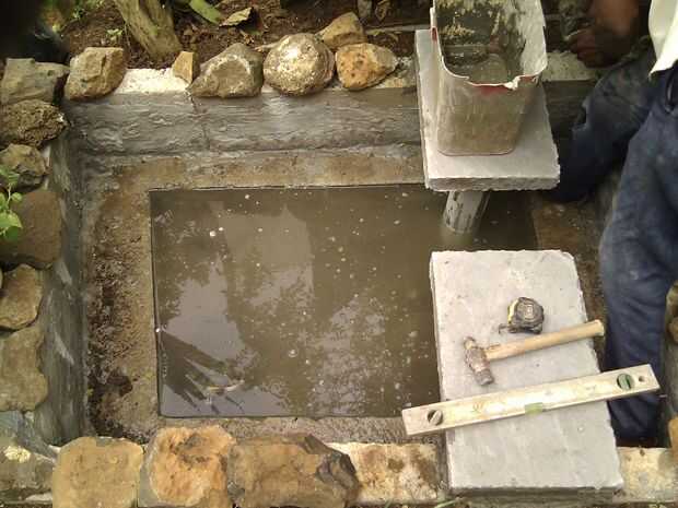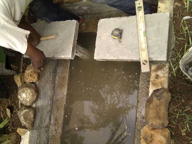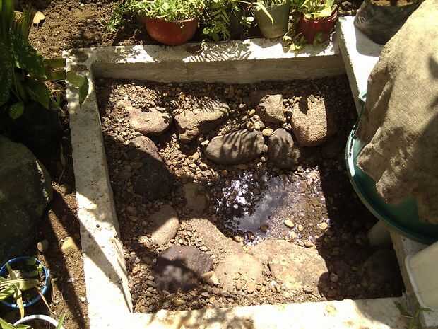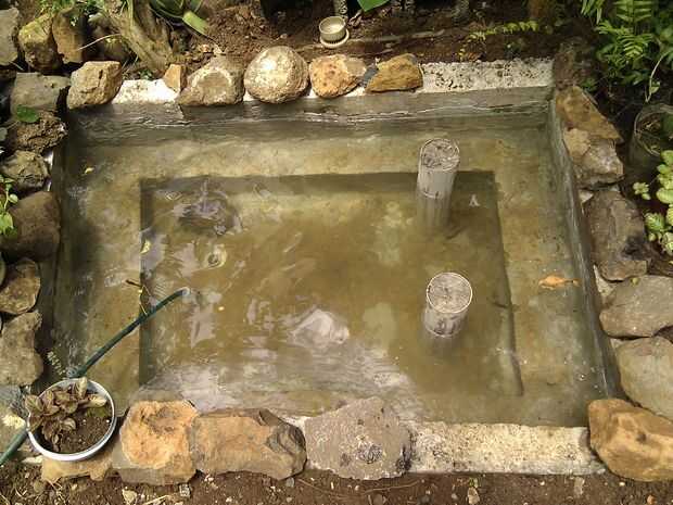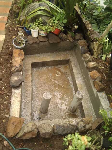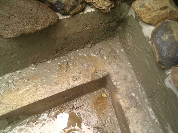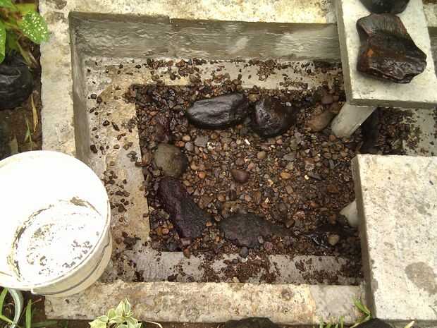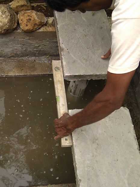 Al día siguiente fue retenido sin embargo el agua sólo en la base. Mientras tanto realmente había plantado hierba alrededor del estanque y había añadido otra decoración. Después de dos días cuando el hormigón estaban listos mi mason agregó mortero en el lado negativo de las losas donde estar descansando en el borde del estanque y en el polo. Utilizando un martillo, medición cinta y mampostería que las losas fueron alineadas correctamente puesto en zona de descanso final.