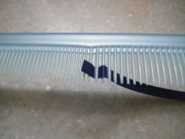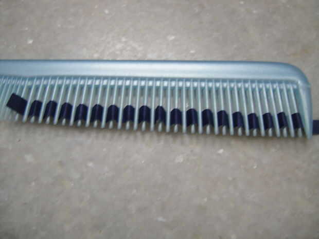 Para obtener la textura necesaria veremos un peine para quilling. Inicio de quilling del papel va encima de un diente del peine y el diente adyacente el papel va debajo de ella (ver imagen 1). Continuar este patrón de longitud suficiente (ver imagen 2). Tomar el papel del peine (tenga cuidado de no deformar el patrón). Comenzar a rodar con los dedos (aquí no es necesario utilizar la herramienta quilling, u otra cosa puede deformar el patrón)(see image 3). El rollo no necesita ser ajustado (ver imagen 4). Aplicar pegamento en el extremo del rollo. Hacer muchos tales rollos. (ver imagen 5).