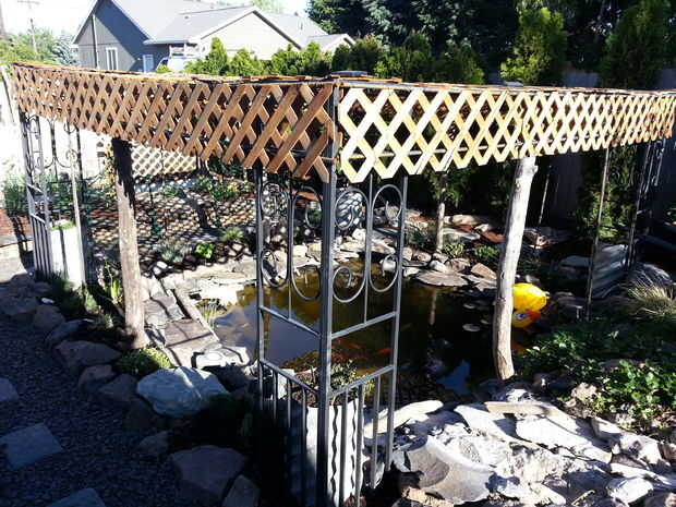 soy un perezoso constructor/crafter. Tienden a construir proyectos en todo lo que tengo en la mano y ahorrar hardware todo que chatarra. En este proyecto, he utilizado dos raíles valla de madera, un viejo mango de rastrillo de 49" de largo, enrejado de sobra, una pantalla solar de un amigo había tirado de su remolque doble ancho 70, L cuatro soportes, un tablero de paleta cortado a la anchura del enrejado y un montón de grapas y tornillos varios.