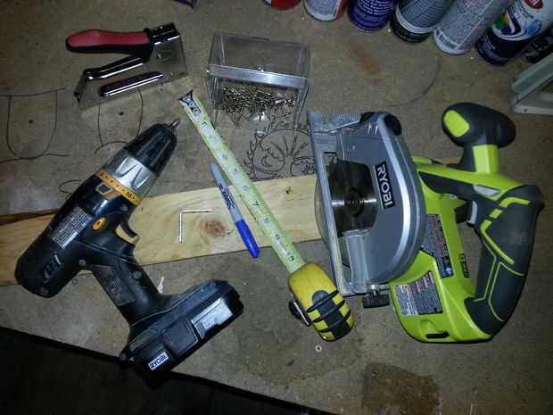 Para mis herramientas, usé mi 18v inalámbrico Ryobi taladro, sierra circular, Sierra zip (no mostrado), grapadora y pinzas, tijeras.
