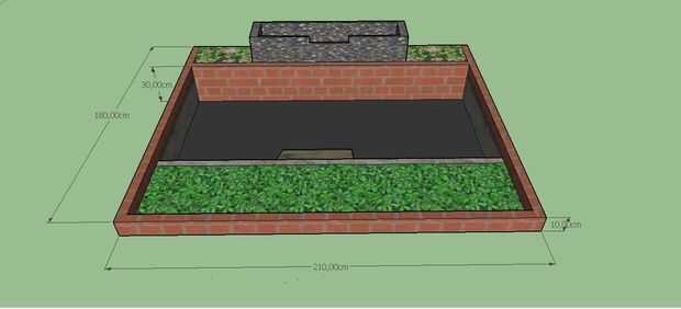 Para que conste, no tengo la experiencia necesaria para construir un estanque en todos. Yo solo estoy buscando referencias en internet y aplicar directamente. Construir este estanque sin constructor profesional del estanque. El estanque será 210 cm x 180 cm. Echa un vistazo a la imagen para más detalles.