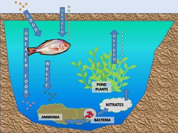 Gracias a Dios por las bacterias. Porque ahora las plantas pueden convertir los nitratos de oxígeno. Algunos del oxígeno es absorbido por los peces y algunos se disipa en la superficie.