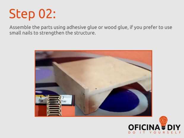 Montar las piezas con pegamento adhesivo o pegamento para madera, si usted prefiere usar clavos pequeños para fortalecer la estructura.