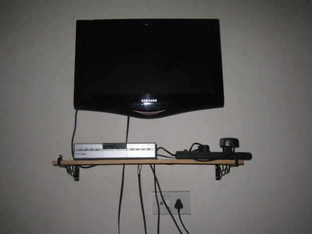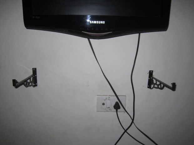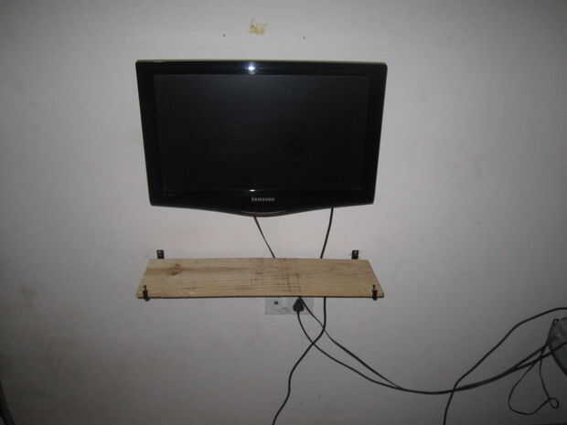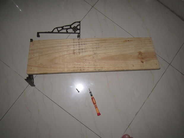 Tengo una pieza de la plataforma de madera de un vendedor de chatarra a muy bajo precio, compré dos abrazaderas de pared L en una ferretería con tornillos a sólo:).