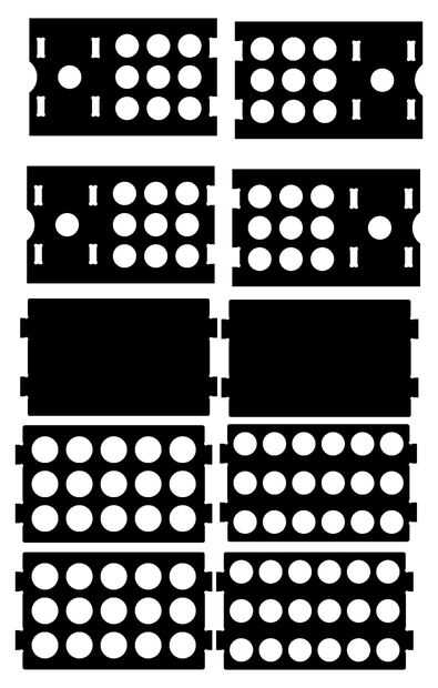 La imagen muestra las partes para la construcción de dos parrillas. Cada columna es una parrilla. El izquierdo es para Cañas costa afuera con los apretones más grandes (agujeros de 1,7 pulgadas). El conjunto adecuado será acomodar barras costeras y de agua dulce (agujeros de 1,5 pulgadas).