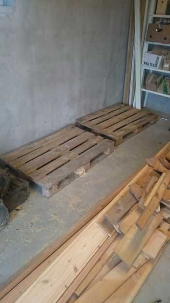 Comenzamos con dos palets. Usted puede utilizar más de dos si tienes habitación para él o para un estante más pequeño.