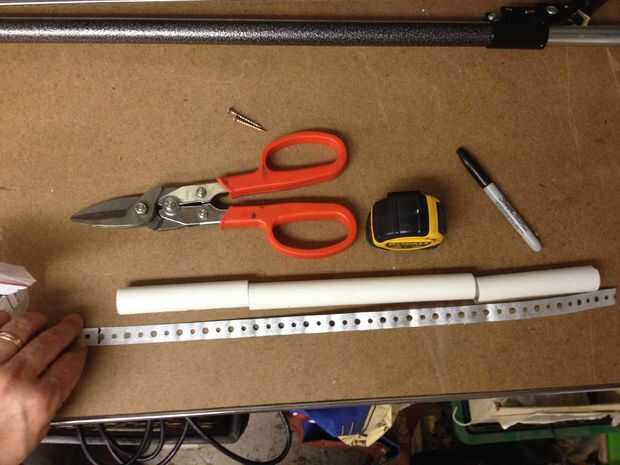 Tomar las tres piezas de PVC y hasta. Descansar algunos correa tubo metálico para que coincida con la longitud de las piezas de PVC. La correa de la tubería tendrán agujeros grandes y pequeños. cortar un tiempo suficiente que tenga al menos un pequeño orificio expuesto más allá de cualquiera de los extremos de la tubería. En mi caso el resultado es una banda de metal 5 "+ 9" + 5 "+ 3/4" + 3/4"= 20.5" largo.