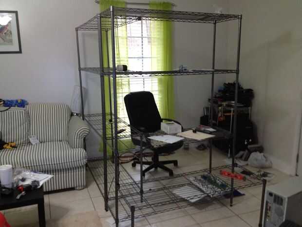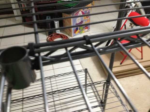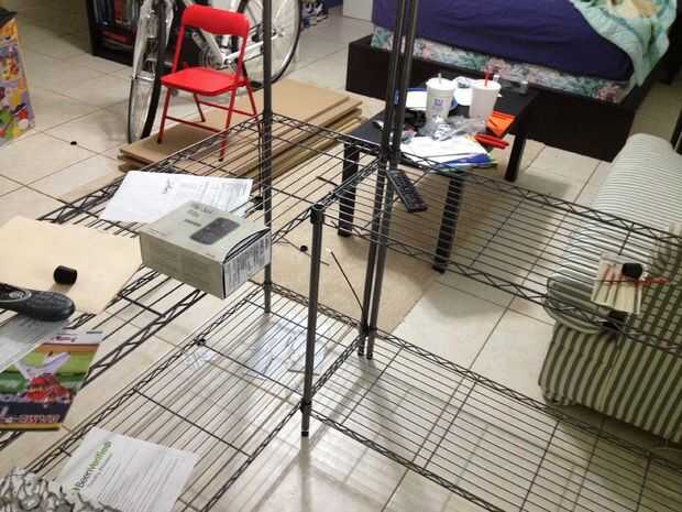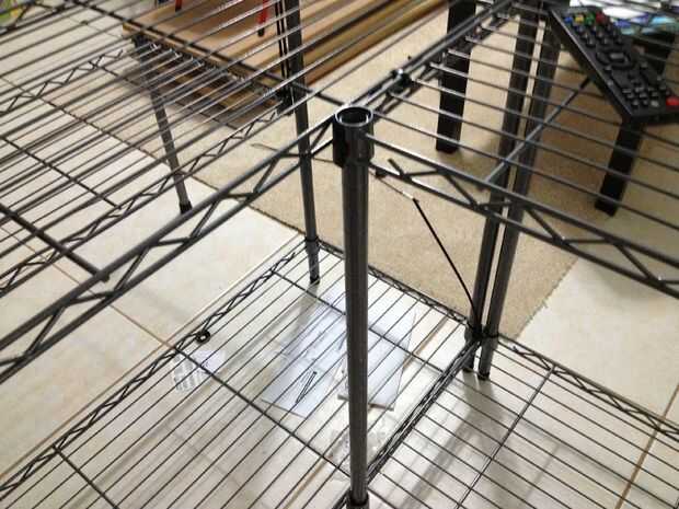 Una vez que el poste fue cortado, tuvimos que unir los dos estantes. He intentado a partir de lazos de cierre metalico que encontre en Walmart, pero no pude conseguirlos lo suficientemente apretada como para restringir el movimiento de los dos estantes sin soporte superior. Abrazaderas de plástico plástico grueso resistente proporcionan suficiente flexibilidad para apretar tan fuerte como sea posible y era capaz de restringir el movimiento de los dos estantes superiores. Si lo haces bien... no debe ser meneo o jugar en alguno de los estantes.
