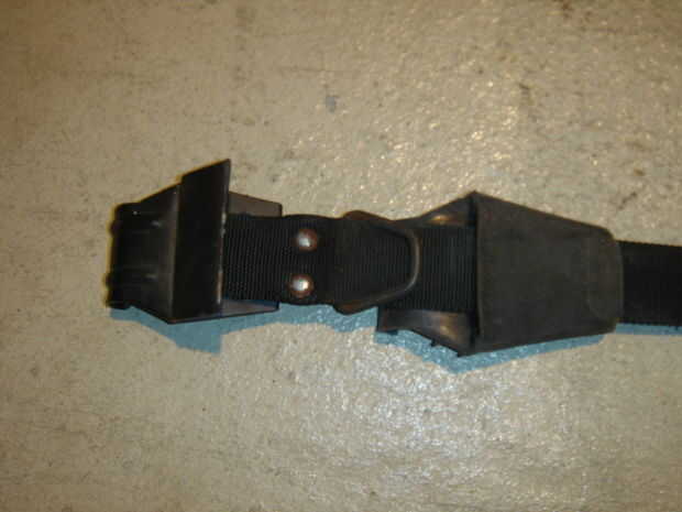 Para quitar el hardware antiguo, tuve que perfore los remaches metálicos en los extremos de la correa. Se puede llegar a ellas deslizando el protector de goma hacia abajo la placa de fijación.