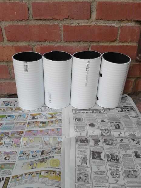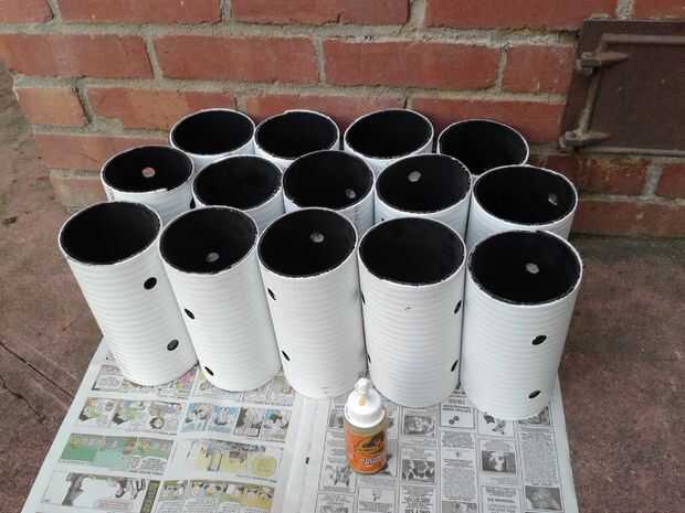 Utilizar un tubo largo de 10 pies con un diámetro de 4". Puede usar PVC (alrededor de $25) o hacer lo que hice. Utilicé el tubo mucho más barato (unos 7 dólares) que se utiliza para líneas de leach. Usar gafas de seguridad y una sierra para metales, cortar el tubo de 8" piezas largas y 14 de ellos para el proyecto. Utilice pegamento multiuso de gorila y unir las piezas como se muestra aquí. Recuerde usar guantes de látex tipo para mantener su cola de manos libres.