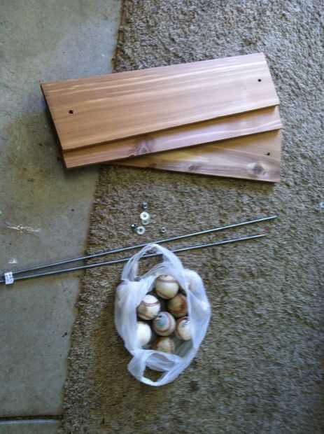 Sólo se necesitan herramientas básicas. A la sierra, un taladro, una amoladora o hack que vi y que está sobre él. Materiales: 3 tablas (lo compré 8 x 6' tablas de la valla de cedro) de 2-3/8 x 36 "todos roscan pelotas de 4-3/8 tuercas de 4-3/8 arandelas planas 20 - utilizadas soportes opcionales para colgar