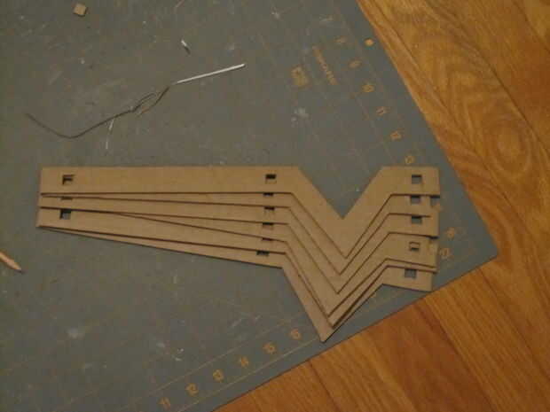 a continuación, vamos a cortar los agujeros cuadrados en tres lugares de cada pieza de cartón. Estos agujeros deben ser