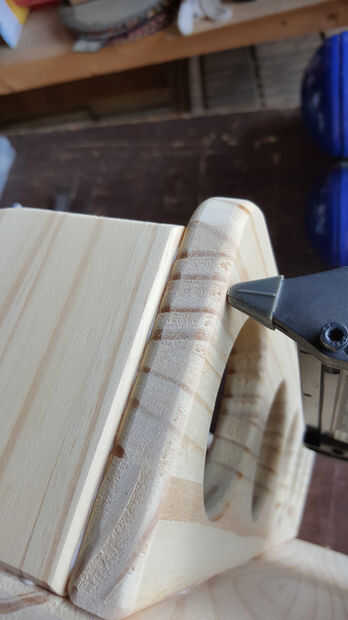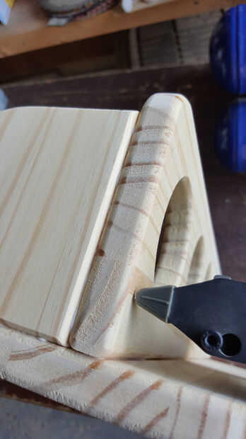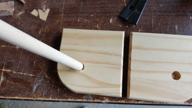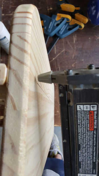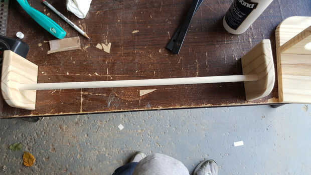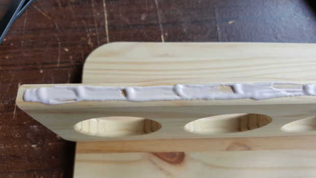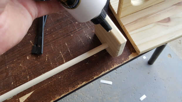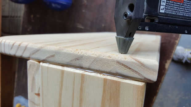 Ahora es el momento para pegar y clavar todas las piezas juntas. Trazar una línea 3" hacia abajo desde la parte superior de la pieza posterior. Se trata de donde la parte superior de la pieza con los agujeros perforados en él se encuentra con la pieza posterior. Ahora poner pegamento en la parte posterior de la pieza con los agujeros. Usted puede sujetar estas piezas si lo desea, sólo estaba de su lado y alineada con la marca del lápiz y clavado de la espalda con un par de clavos. Ahora encole la espiga en las piezas laterales. Tomar eso Asamblea y péguelo a la Asamblea que ya hicimos. Las piezas laterales de la parte superior y respaldo con la clavadora de clavos. Si no tienes un martillo neumático, entonces siempre puede utilizar unos tornillos. Sólo asegúrese de que los orificios.