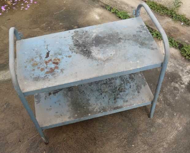 Este estante que consta de dos 2 X 1' galvanizado hierro piezas horizontales se habían utilizados para guardar sartenes húmedos, aceitosos y calientes. Como resultado hubo acumulación de aceite y corrosión severa lleva a una abertura considerable en la pieza superior.