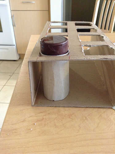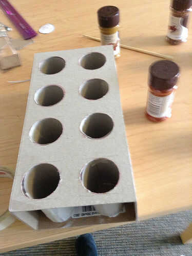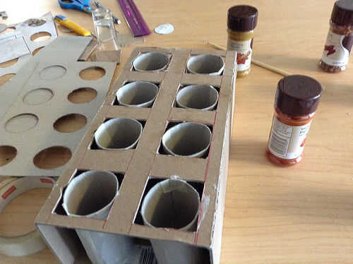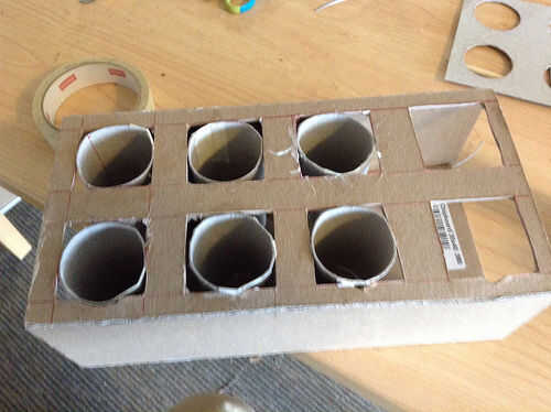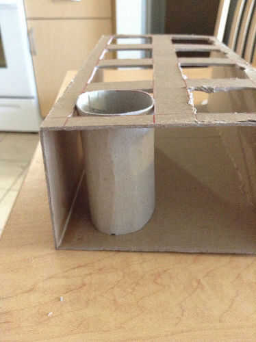 Finalmente, cuando eso termine, pegamento de la capa superior de la caja (cartón con agujeros) sobre la primera capa (el cartón con orificios cuadrados, vivienda ahora los cilindros).