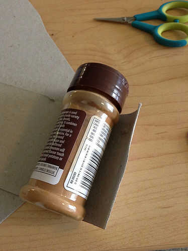 Cortar un trozo de cartulina la altura exacta de su estante de especia de LEGO y la longitud es el perímetro de su envase de la especia. Finalmente, usted recibirá 8 cilindros abiertos de similar tamaños. Entonces, cuando eso termine, pegue los cilindros en la caja sí mismo.