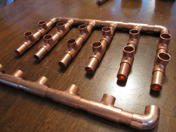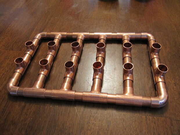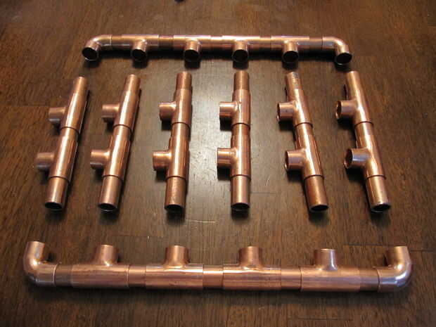 El diseño original tenía solamente una fila y sólo podría sostener 6 tubos, pero quería más especias en el rack, así que hemos ampliado. Para agregar otra fila, simplemente cortar 6 piezas 1,5 pulgadas de tubo de cobre y 6 piezas de T más cobre.