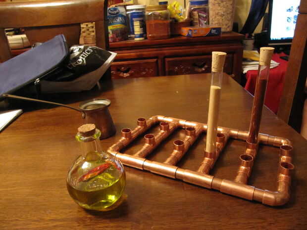 Conseguir algunos tubos de ensayo y llenarlos con tus especias favoritas.  Las tapas de corcho y, por último, en su nuevo estante de especia de steampunk.