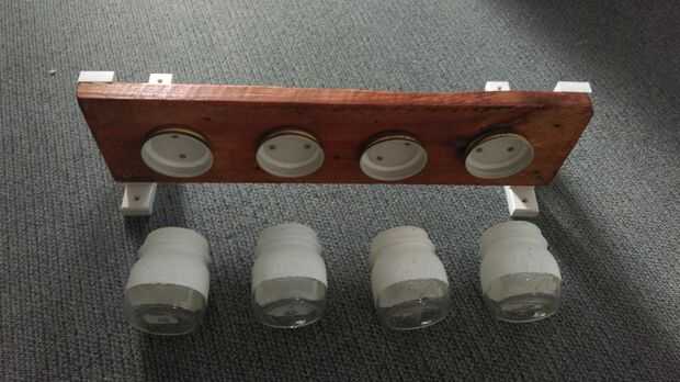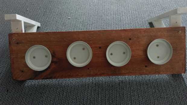 -Utilizando dos tornillos fijar cada tapa en la parte inferior de la plataforma. Se puede medir para asegurarse de están perfectamente alineados o sólo puede ponerlos donde quiera. Sólo asegúrese de que hay suficiente espacio entre ser capaces de abrir los contenedores.