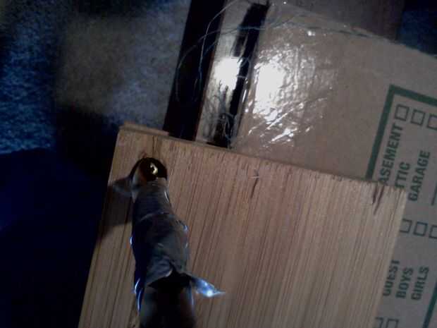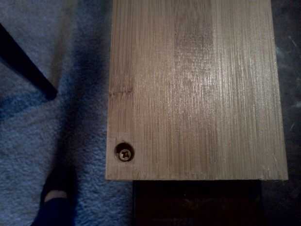 Por último, medir donde usted quiere el agujero y ve por ella! Creo que hicieron 3/8" de la parte superior y 1/2" desde el lado de ambos orificios. Asegúrese de que en su pieza "frente" y de su pedazo de "back" para conseguir un frente más bonito. Perforar hacia abajo hasta que la broca lo hace a través de dos piezas de moldura y en la pieza de madera se utiliza para proteger la superficie de trabajo ;)