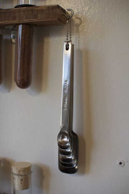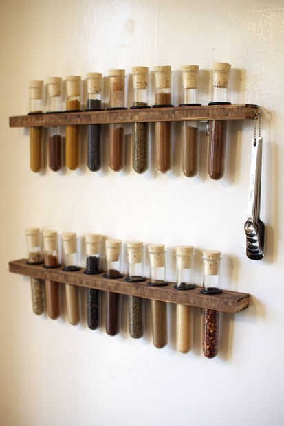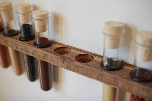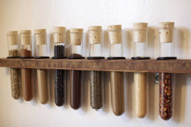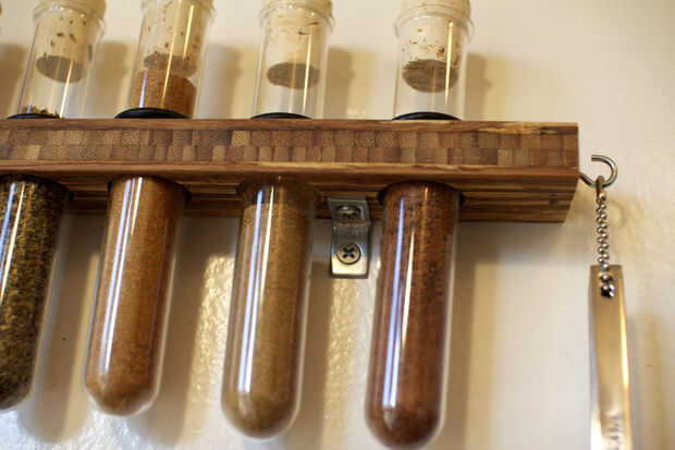 Cortar tiras de tamaños apropiado de la madera del bastidor tubo de ensayo. En una prensa del taladro, utilice un 1 1/8" forstner bit para crear agujeros uniformemente espaciados sobre la parrilla. Trate de hacer lo mas recto posible si usas un taladro de mano. Deslice los O-rings en los tubos de prueba, llene con especias e Inserte el tapón de corcho en la parte superior.