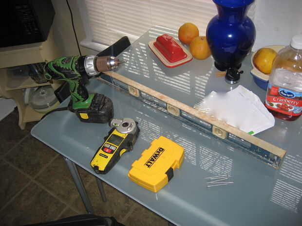 taladro, nivel, buscador de birlos, brocas, tornillos (no en la foto: Plaza) madera: 1 x 8 y 1 x 3 (arrancó un 1 x 6) corte 1 x 8 para que se ajuste en el ángulo (ángulo de 45 grados)