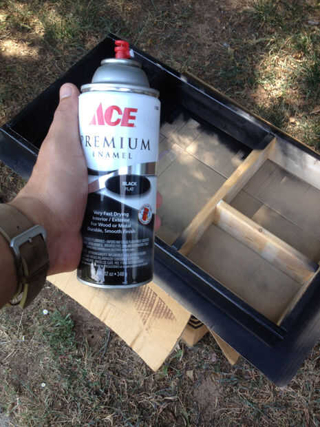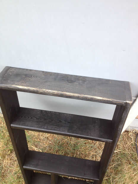 Pintura: Para el marco solo usé 1 de pintura en aerosol negra mate para cubrir el marco y un trozo de madera mientras se secaba la mancha. Practique primero, en la pieza de chatarra para obtener el cuelgue de ella. Entonces, utilicé una lijadora eléctrica con grano 220 a "angustia" la pintura. En las fotos puedes ver los compara a los estantes de fondo pintado del estante superior lijado.