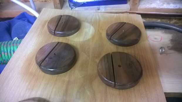 Después de cortar el círculo de los soportes de montaje de la madera I lija el acabado y rociado a ellos con una base de agua clara corte final para añadir contraste al acabado negro mate del acero.