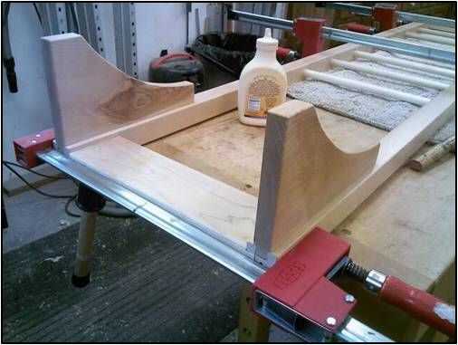 Aplique el pegamento a la espiga de cola de Milano en los ambos extremos de la camilla superior y deslice la camilla en la cola de Milano deslizante. Asegúrese de que la parte superior de la camilla esté al ras con los extremos de los postes.