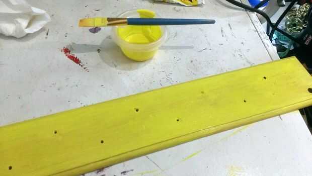 Una vez terminé lijado, utiliza una toalla de papel apenas humedecido para limpiar el polvo y comenzó a pintar. Usé pintura acrílica del artista por un tubo - amarillo de cadmio - mezclada con un poco de blanco y un poquito de agua. Porque pintaba la madera cruda, y quería un buen acabado opaco, terminé de aplicar cuatro capas finas.