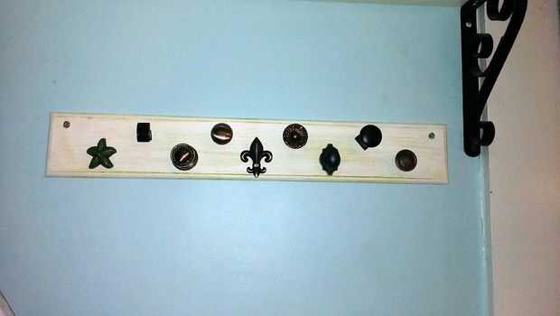 Porque todos los botones que utilicé fueron metal sólido, el estante entero terminó siendo bastante pesado. Hemos colgado en la pared con anclajes de pared, para estar en el lado seguro.