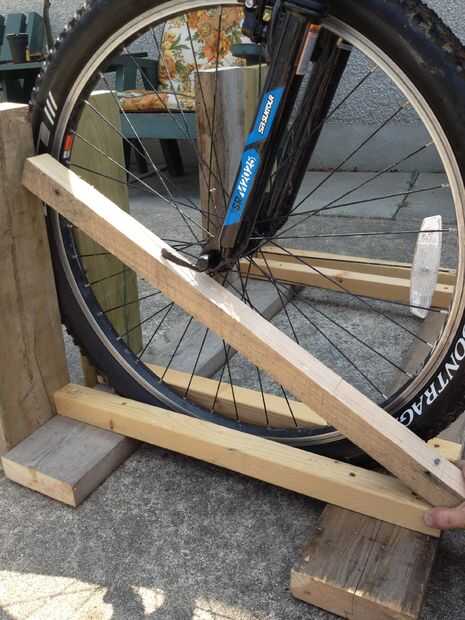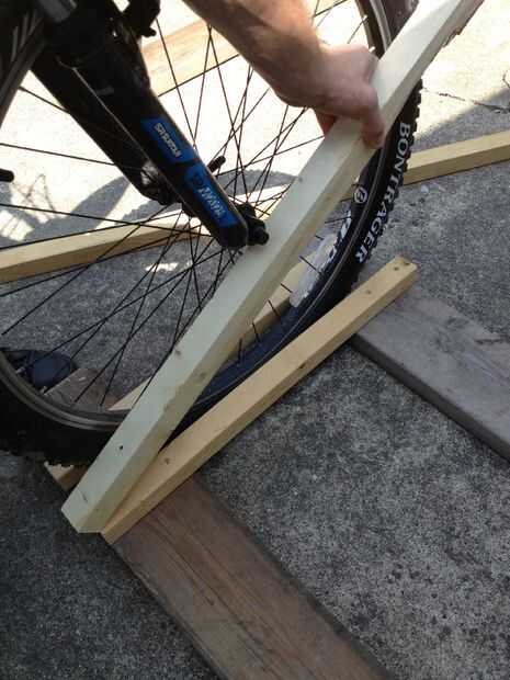 Esta es probablemente la parte más importante apoyar su bicicleta para minimizar de tirarse alrededor. Sus llaves de lado se sentará contra el costado de tus llantas en un ángulo de funcionamiento a través de sus rayos y en el centro de su neumático donde el neumático se conecta con su horquilla delantera. Realizar una medición donde el 2x2s se sitio y cortar 4 piezas para una pulgada más de esta medida. Una vez que las tablas se cortan a la longitud sostener uno en su lugar y mantenga el borde de la Plaza contra el 2 x 6 que constituye el tope trasero y la parte plana de su escuadra contra su 2 x 2 su explotación en el lugar. Utilice un lápiz y marque una línea en su 2 x 2 donde se encuentra la Plaza contra él. Ahora tiene una línea para cortar el ángulo correcto en nuestro 2 x 2. Repetir este proceso para las cuatro piezas todas y también a la parte inferior de sus soportes transversales. Si tienes un transportador que podría tomar los ángulos por su primera aburren y solo los copie al resto. Tornillo en lugar así que corren a lo largo de la llanta. La parte inferior debe estar encima de los rieles de la base del neumático.