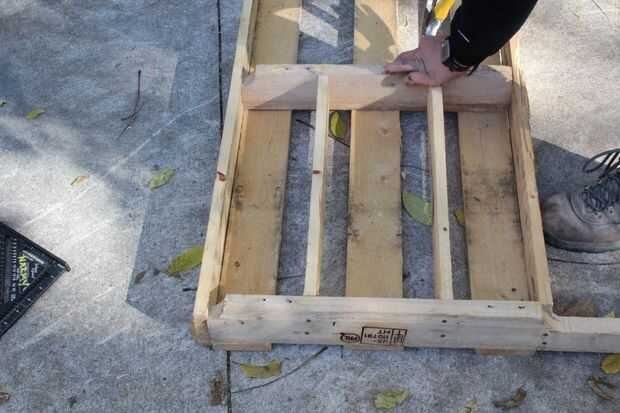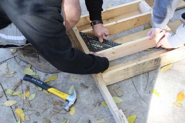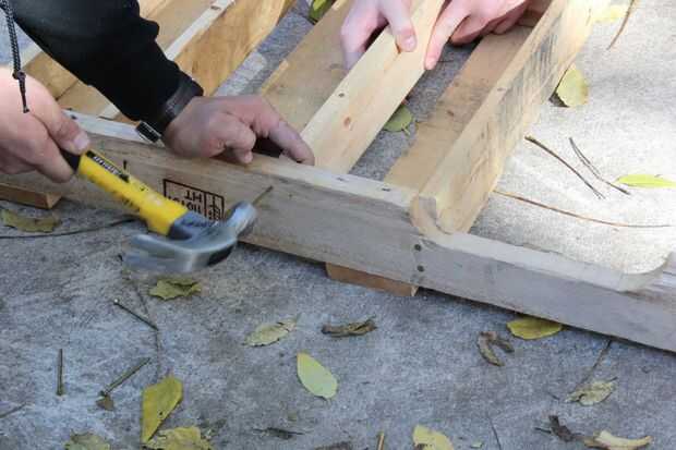 Espacio de estantes hacia fuera uniformemente, al ras con la parte delantera. Conducir dos clavos en cada lado de la plataforma, perpendicular a las placas de poste. Otra persona puede ser necesaria para mantener las tablas en su lugar mientras martilla. Repita para el segundo estante.