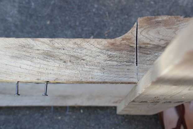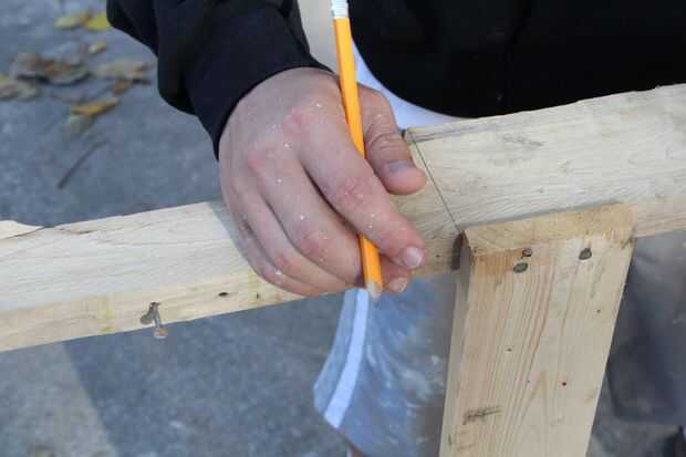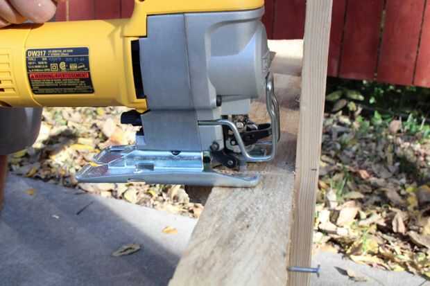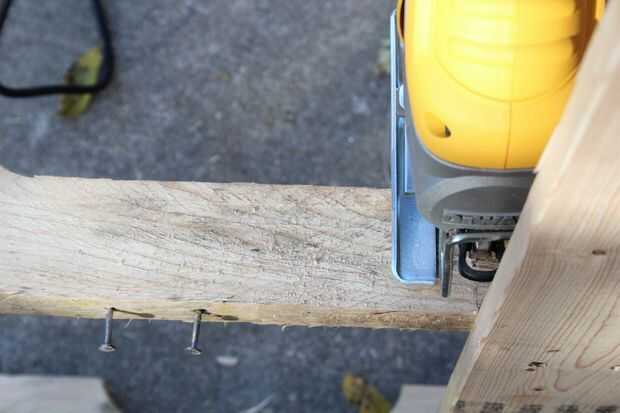 Cuidadosamenteusando una sierra de calar, Sierra las tres tablas de postes de un lado al ras con el borde del panel de la cara exterior. Lápiz y herramienta para dibujar líneas para guiar el corte de medición. Corte desde el lado opuesto a los paneles de la cara. Una sierra de arco deba ser utilizado.