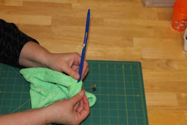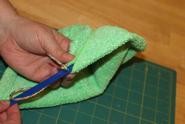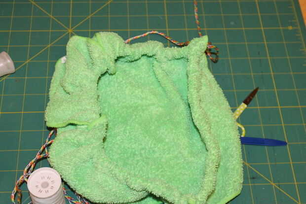 No corte el paracord antes de empezar a roscar. Usar un enhebrador o un alfiler, hilo de rosca el paracord a través de cada cubierta en orden secuencial para que el cable va alrededor de toda la bolsa. Acabarás con los dos extremos al lado del otro.