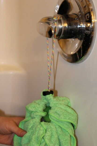 Cuando estés listo para ducha, gancho de cable sobre la cabeza de ducha o grifo y abra la pinza de resorte hasta que esté cerca de la cabeza de grifo o ducha así que se puede llegar fácilmente en el bolso y no caiga de la cabeza del grifo o ducha.